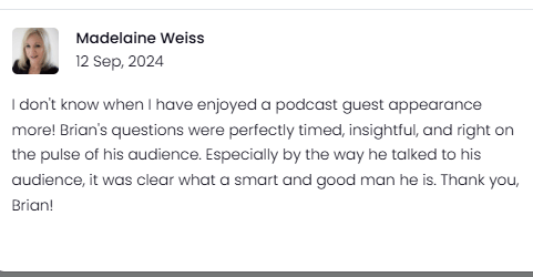 I don't know when I have enjoyed a podcast guest appearance more! Brian's questions were perfectly timed, insightful, and right on the pulse of his audience. Especially by the way he talked to his audience, it was clear what a smart and good man he is. Thank you, Brian!